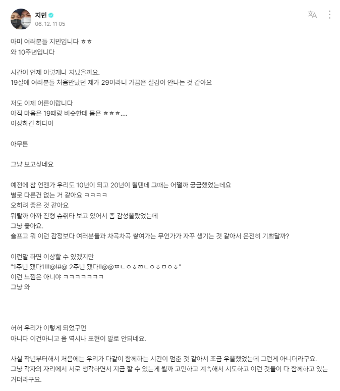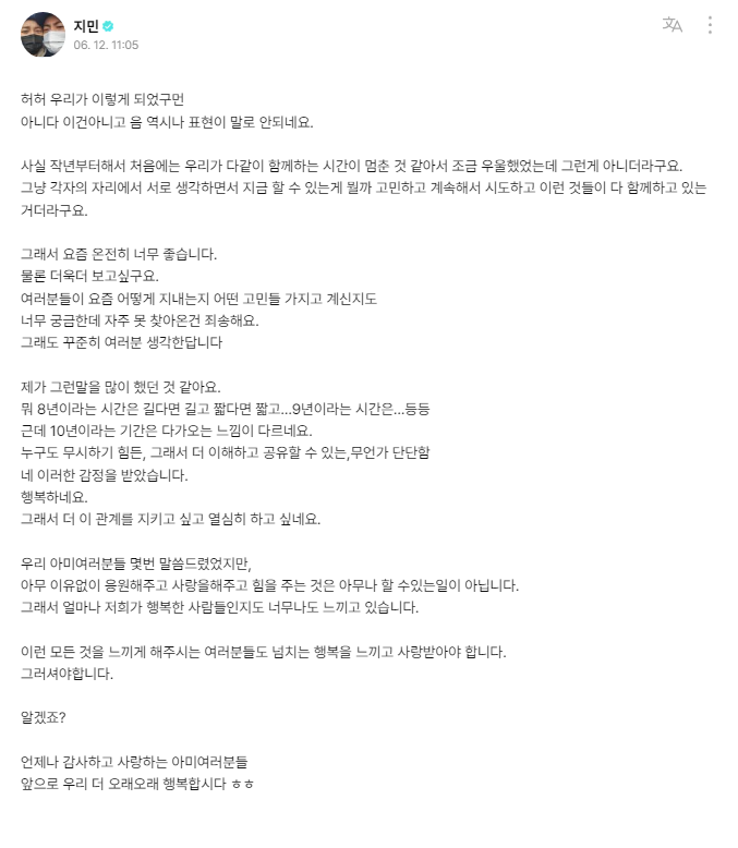 Jimin took to his Weverse account to pen the following letter to his dedicated fans:
