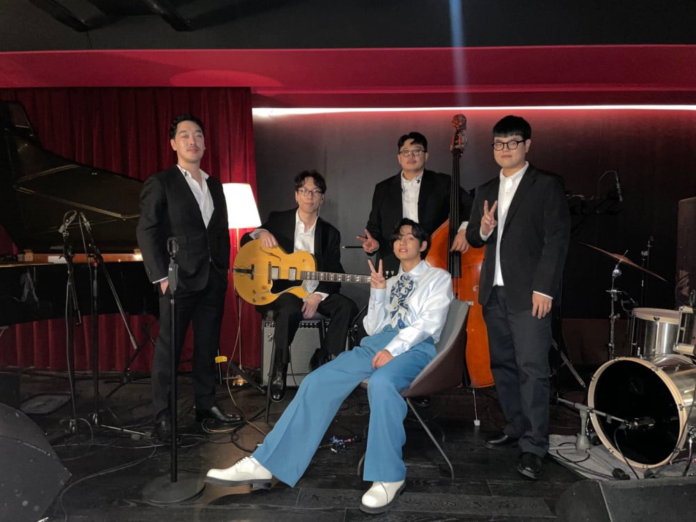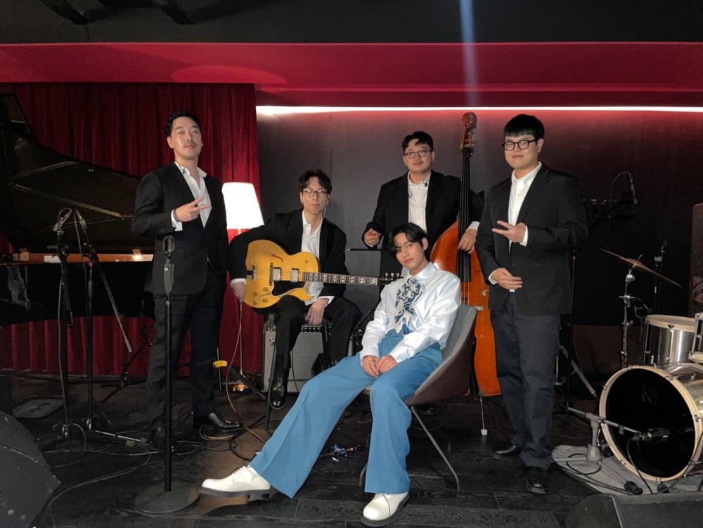 V also took to his personal Instagram and Weverse to share behind-the-scenes photos of himself and his live jazz band. His band consisted of DOCSKIM on keys, John Eun on guitar, Kim Daeho on bass, and Kim Dong-hyun on drums.
